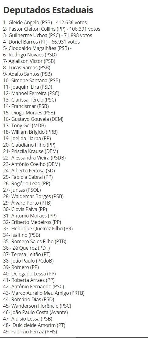 Entrar Bem-vindo! Entre na sua conta seu usuário sua senha Esqueceu sua senha? obter ajuda Crie a sua conta aqui Crie a sua conta aqui Bem vinda! registre-se para uma conta seu e-mail seu usuário Uma senha será enviada por e-mail para você. Recuperar senha Recupere sua senha seu e-mail Uma senha será enviada por e-mail para você. InícioPolíticaConfira os deputados estaduais eleitos por Pernambuco Confira os deputados estaduais eleitos por Pernambuco Author Fábio Cardoso Date 7 de outubro de 2018 Category Política Compartilhado FacebookTwitterWhatsAppTelegram Artigo anteriorEm vídeo, Raul agradece ao povo lagoagrandese pelo apoio. “Muito obrigado e um grande abraços a todos vocês”Próximo artigoConfira os deputados federais eleitos por Pernambuco Veja também David Lima confirma pré-candidatura a deputado federal em evento com lideranças políticas em Juazeiro CPI para investigar Moraes e Toffoli no caso Banco Master atinge número mínimo de assinaturas no Senado Trabalho do deputado Lucas Ramos vem mudando o cenário da agricultura familiar em Pernambuco DEIXE UMA RESPOSTA Cancelar respostaFaça login para deixar um comentário Recent posts David Lima confirma pré-candidatura a deputado federal em evento com lideranças políticas em Juazeiro 9 de março de 2026 CPI para investigar Moraes e Toffoli no caso Banco Master atinge número mínimo de assinaturas no Senado 9 de março de 2026 Prefeitura de Casa Nova inicia oferta do Nirsevimabe e amplia proteção de bebês contra bronquiolite na rede municipal 9 de março de 2026 Caso Beatriz: STJ rejeita recurso da defesa de Marcelo da Silva Caso Beatriz: STJ rejeita recurso da defesa de Marcelo da Silva 9 de março de 2026 Irã x Estados Unidos: o que está por trás do conflito e por que o tema pode cair no vestibular 9 de março de 2026