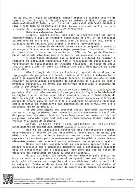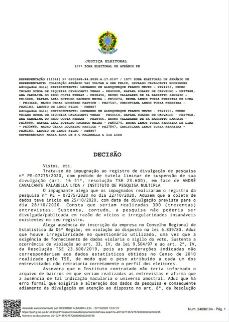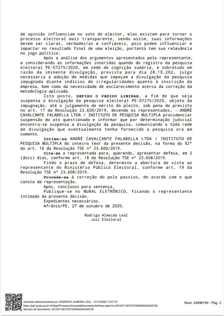 Em sua decisão, o juiz ressaltou que as pesquisas eleitorais tem sua importância pois elas alimentam as campanhas dos candidatos pelo voto útil, estratégico e pode influenciar no resultado de uma eleição sendo assim, suas informações devem ser claras, verdadeiras e confiantes.