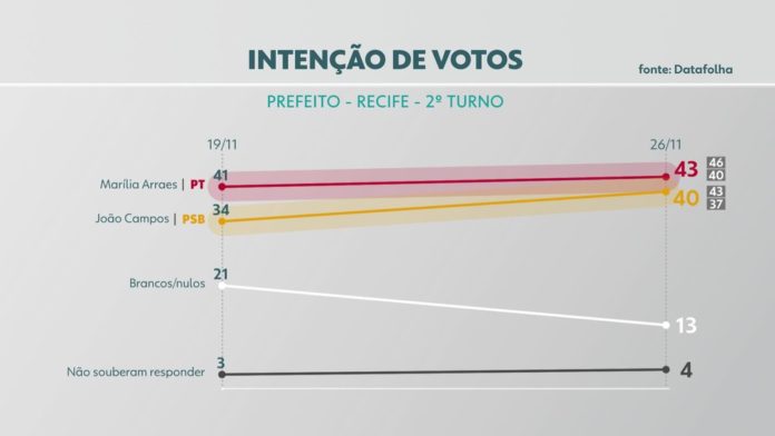 O Datafolha divulgou, hoje, o resultado da segunda pesquisa do instituto sobre o segundo turno da eleição para prefeito do Recife. O levantamento foi realizado entre os dias 24 e 25 de novembro e tem margem de erro de 3 pontos percentuais, para mais ou para menos.