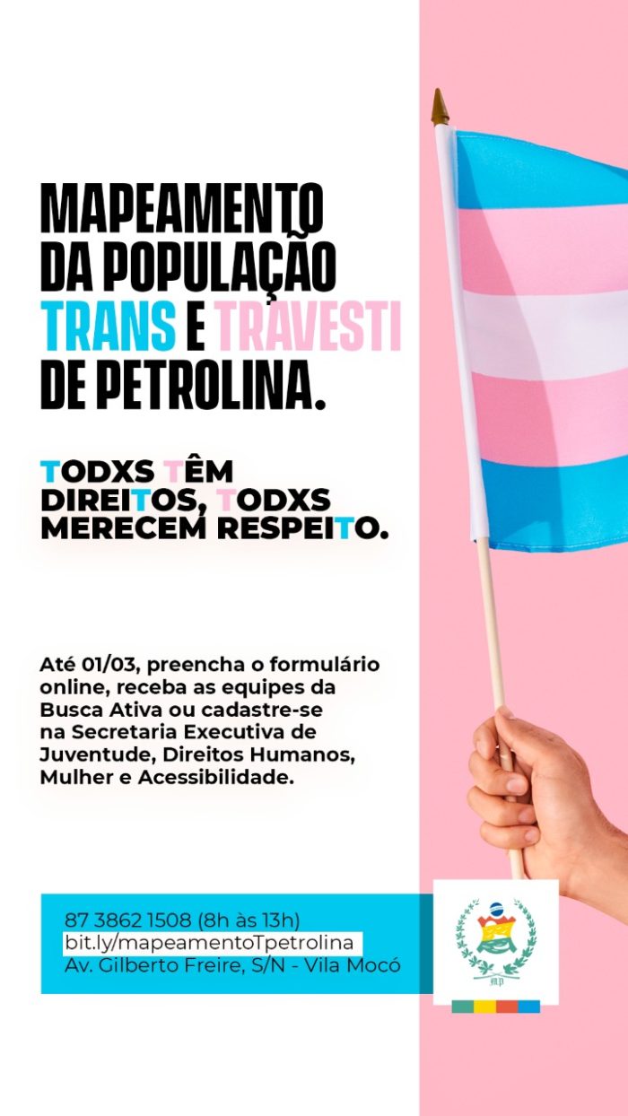 A Prefeitura de Petrolina encerra na próxima semana o seu primeiro mapeamento da população trans da cidade. O cadastro teve início no dia 29 de janeiro e segue até a próxima segunda-feira, 1º de março, para toda população T (transexual, travesti e transgênero).