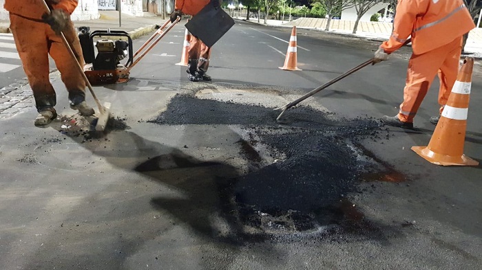 Tapa-buracos: Melhorias também foram feitas na malha viária do Centro, através da Operação Tapa-buracos. Após o encerramento das atividades comerciais, os trabalhadores iniciaram o serviço. Ao todo, foram usadas cerca de 10 toneladas de material somente na última sexta-feira (18).