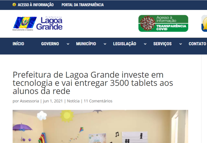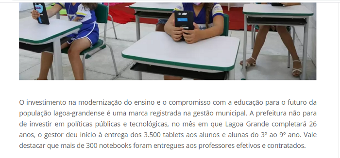 Em consulta ao site institucional da prefeitura da prefeitura Municipal de Lagoa Grande (PE), constamos que a prefeitura pretende entregar aos alunos da rede municipal de ensino, 3.500 tablets, entretanto, o que chama atenção é a exclusão de alunos do 1º ano, 2º ano e alunos da Educação de Jovens e Adultos (EJA). Confira um trecho da nota, onde a prefeitura cita a entrega dos tablets apenas aos alunos e alunas do 3º ao 9º ano.