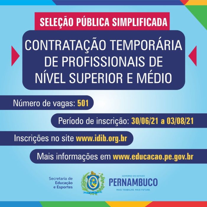 A Secretaria de Educação e Esportes de Pernambuco abriu seleção pública simplificada para contratação temporária de profissionais de nível superior e médio. Ao todo, são 501 vagas destinadas aos cargos de Professores do Atendimento Educacional Especializado – AEE (77), Intérprete de Libras (41), Braillista (42), Instrutor de Libras (23) e Profissional de Apoio Escolar (318), que irão atuar no âmbito da SEE. Os interessados devem se inscrever, exclusivamente, pelo site www.idib.org.br até o dia 03 de agosto.