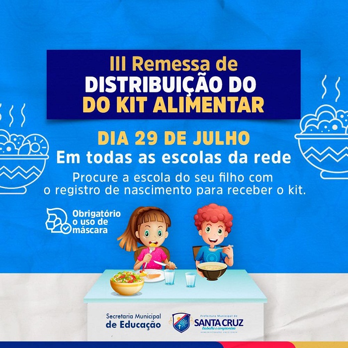 A Prefeitura de Santa Cruz através da Secretaria de Educação mantendo o compromisso de garantir uma alimentação de qualidade realiza a entrega de mais uma remessa de kit alimentar, a partir desta quinta-feira (29). É a terceira etapa para os alunos da rede municipal de ensino.
