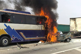 Diante da batida que houve entre os veículos na pista, o ônibus e um dos carros pegaram fogo.