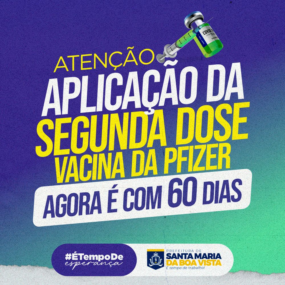 O prefeito de Santa Maria da Boa Vista, George Duarte, anunciou, hoje (14), que o município passará a aplicar a segunda dose da Pfizer após um intervalo de 60 dias contados da primeira imunização. Antes, a cidade utilizava o prazo de 90 dias, seguindo orientação do Ministério da Saúde. É importante salientar que a medida já passa a valer de imediato.