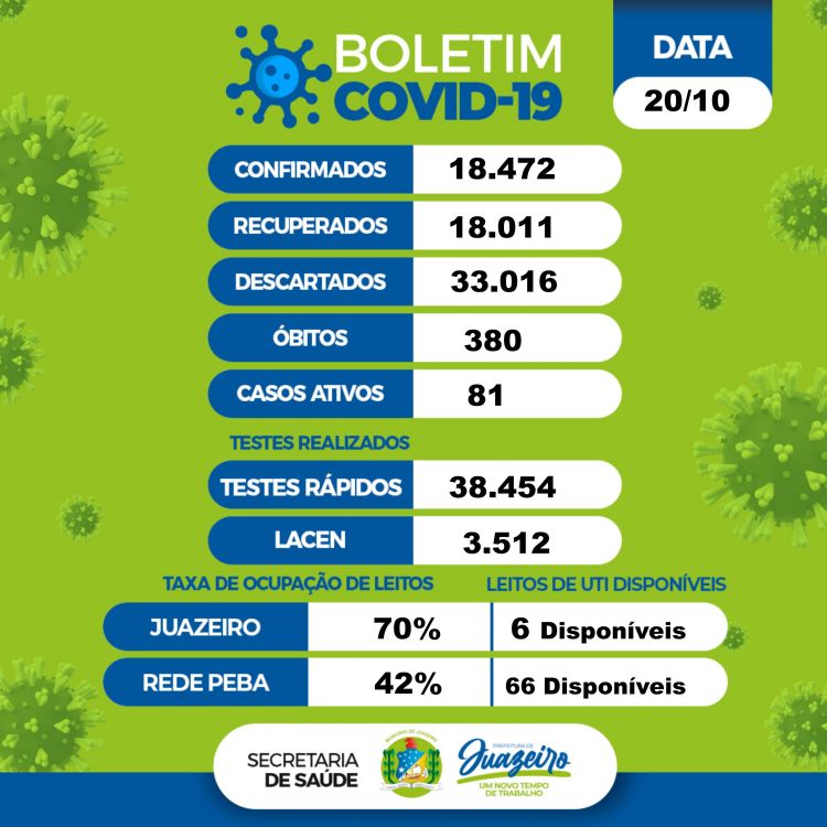 31 novos casos foram confirmados. De acordo com o levantamento, 18.472 moradores foram infectados desde o início da pandemia na cidade, dos quais 18.011 já estão recuperados. Os casos descartados somam 32.882. Juazeiro tem 81 casos ativos do novo coronavírus.