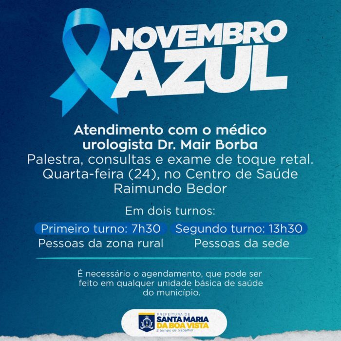 A Prefeitura de Santa Maria da Boa Vista anunciou que irá ofertar, nessa quarta-feira (24), atendimento médico e exame de toque para homens do município. A iniciativa faz parte da campanha Novembro Azul e será coordenada pelo médico especialista em urologia Dr. Mair Borba. Os atendimentos ocorrerão no Centro de Saúde Raimundo Bedor, em dois turnos. O primeiro terá início às 7h30 e será destinado para a população da zona rural. Já a partir das 13h30, será a vez do atendimento para o público da área urbana.