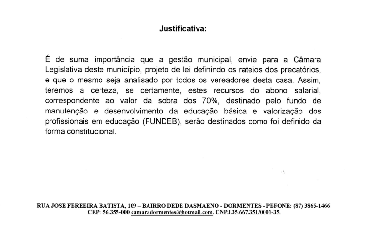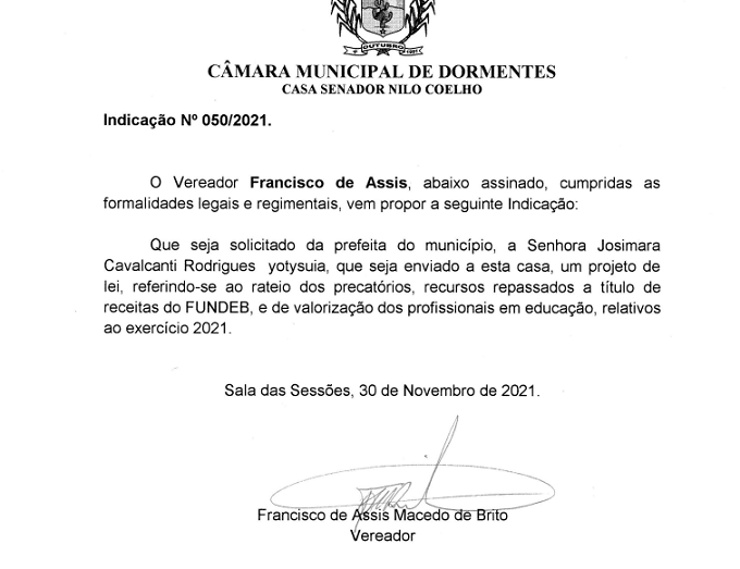 Na mesma indicação o vereador cobra o rateio dos precatórios. “ O precatório é direito dos profissionais em educação e eu não vejo a prefeita se posicionar sobre o assunto”, declarou.