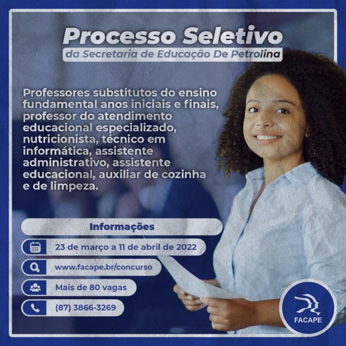 A Faculdade de Petrolina – Facape, em parceria com a Prefeitura Municipal, está com inscrições abertas para o processo seletivo de profissionais da educação. As vagas são de contratação temporária para cargos de nível superior, médio, fundamental e técnico.