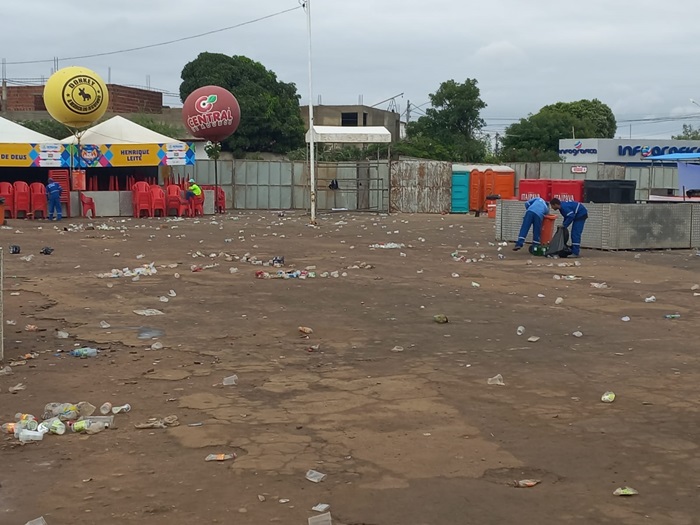 Ao longo de toda manhã, cerca de 12 trabalhadores atuaram na varrição, catação e remoção do lixo deixado no pátio e entorno da festa. O trabalho iniciado por volta das 7h seguiu ao longo da manhã e contou com o apoio de caçambas e caminhões de coleta.