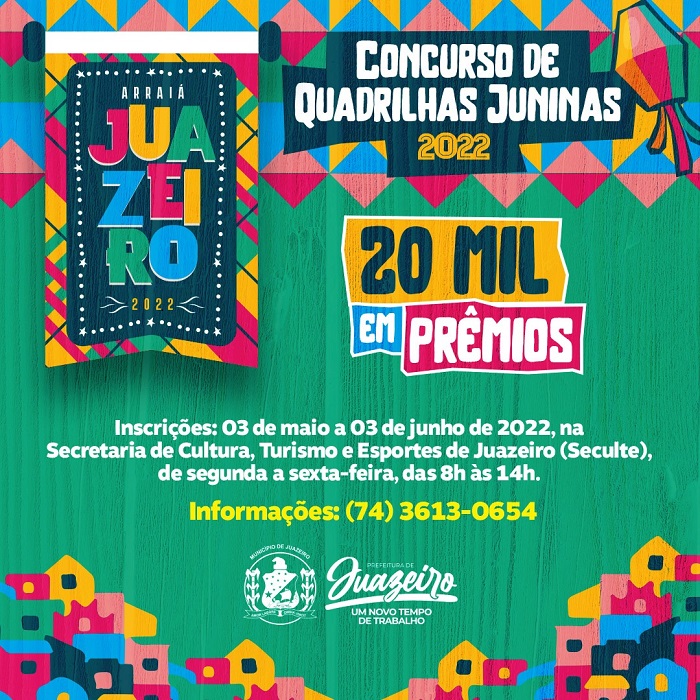 A Prefeitura de Juazeiro, através da Secretaria de Cultura, Turismo e Esportes (Seculte), lançou no Diário Oficial do Município, desta segunda-feira (02), o edital do Concurso de Quadrilhas Juninas 2022. As inscrições acontecem até o dia 3 de junho, por meio do formulário eletrônico: https://forms.gle/uCApWWZYpAZkc5T7A, ou presencialmente, de segunda a sexta-feira, das 8h às 14h, na Seculte. A Secretaria está localizada na Praça Imaculada Conceição (Praça da Bandeira), nº 20, Centro.