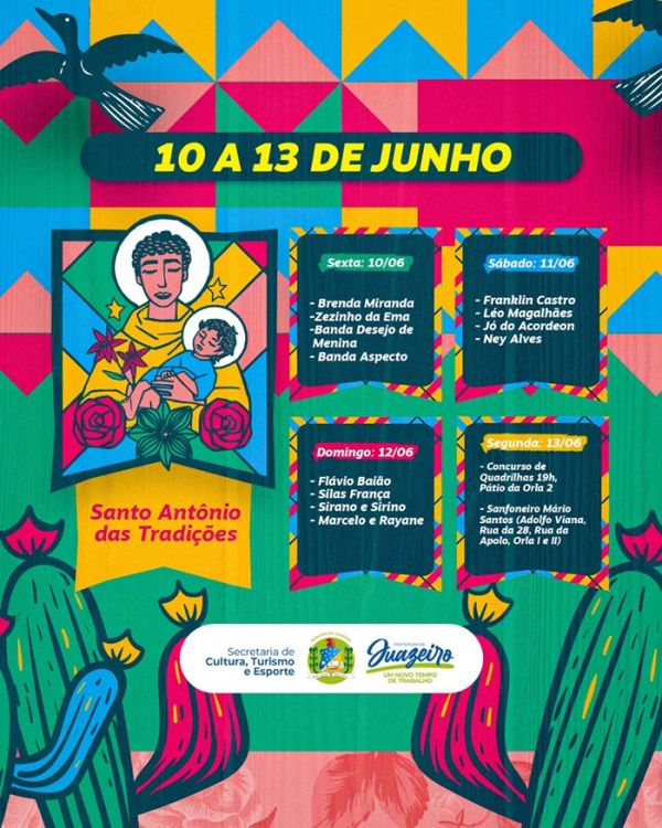 Além de Léo Magalhães, outras atrações como Desejo de Menina, Sirano e Sirano, Zezinho da Ema e Flávio Baião também participam da festa. No dia 13 de junho, o concurso de Quadrilhas promete abrilhantar a Orla 2 com muito colorido e tradição.