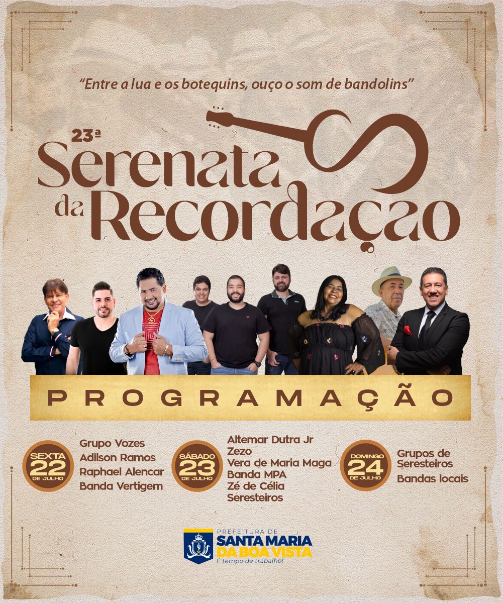 “Santa Maria da Boa Vista estará de braços abertos para receber os amantes da boa música. São dois anos de espera e, finalmente, poderemos matar a saudade da festa mais charmosa do Nordeste brasileiro. A 23ª Serenata da Recordação será inesquecível”, afirmou o prefeito George Duarte.