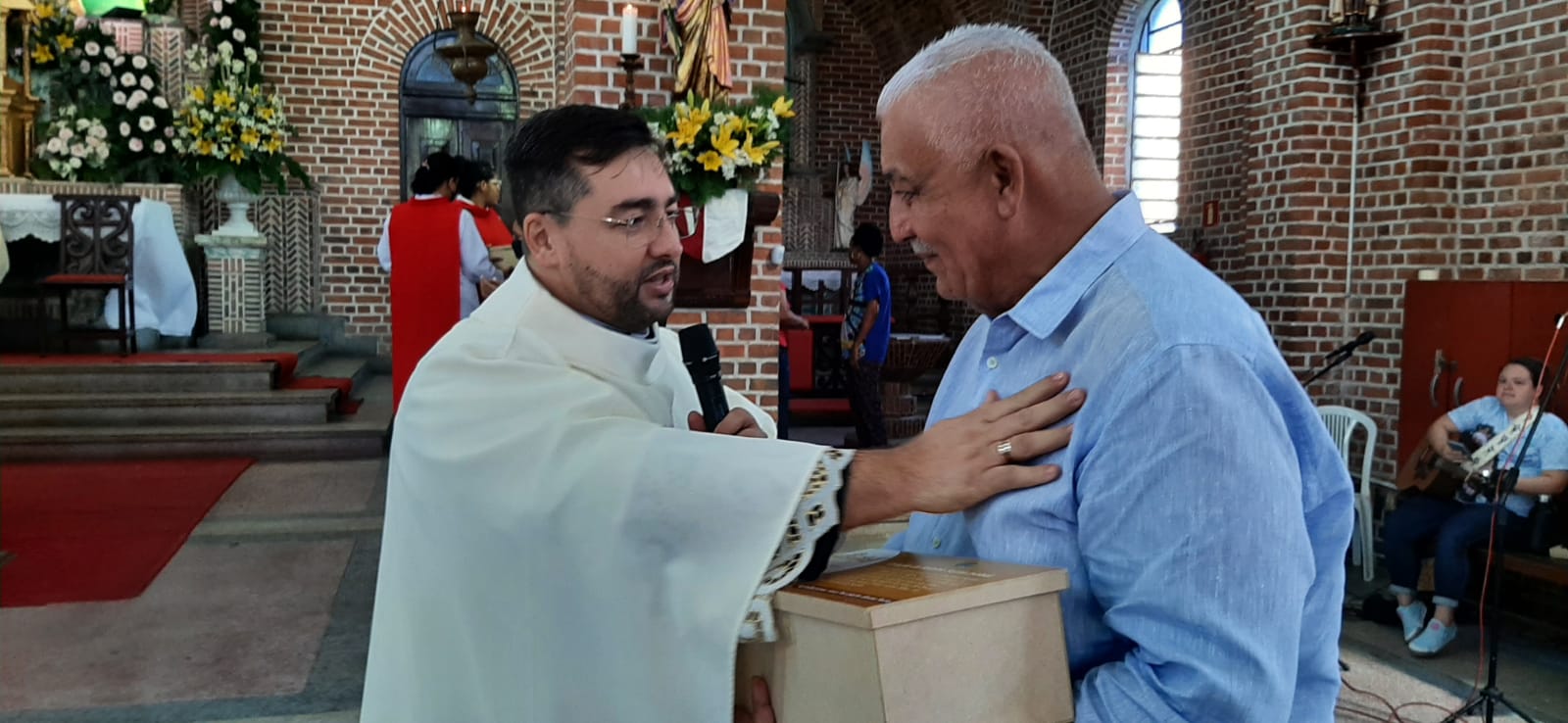 Ramos Santana tem uma linda história com a paróquia de Santa Isabel Rainha de Portugal. Aqui ele casou com sua amada esposa Dona Maria há 45 anos. Ele conhece cada cantinho desse local Santo e cheio de energias positivas. Não é atoa que ao entrar na casa do Senhor para essa solenidade eucarística, Ramos foi recebido com muito amor por todos. Vimos nos olhos das pessoas ali presentes sentimento de muito respeito com Ramos, mostrando assim que de fato tem total respaldo daqueles que o amam e apreciam sua presença.