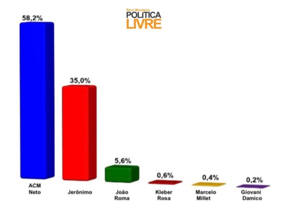 Os dois são seguidos à distância pelo candidato João Roma (PL), que aparece com 5,6%, Kleber Rosa (PSOL), com 0,6%, Marcelo Millet (PCO), com 0,4%, e Giovani Damico (PCB), que registra 0,2%