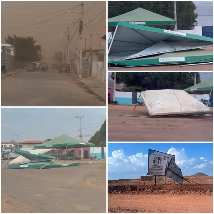 As imagens mostram alguns locais completamente tomados por poeira e uma forte ventania, que preocupou moradores e causou alguns prejuízos, sem chuva.