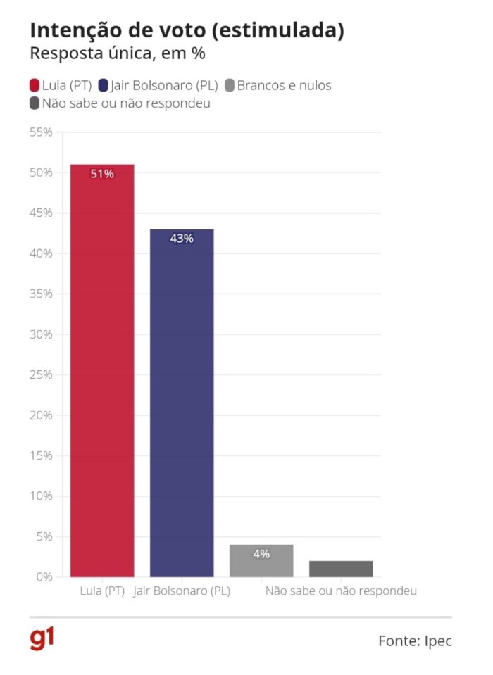 Pesquisa do Ipec divulgada hoje, encomendada pela Globo, aponta que o ex-presidente Luiz Inácio Lula da Silva (PT) tem 51% de intenção de votos no segundo turno e que o presidente Jair Bolsonaro (PL) tem 43%. A margem de erro é de dois pontos percentuais, para mais ou para menos.