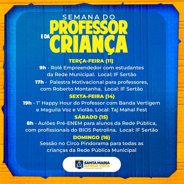 A Prefeitura de Santa Maria da Boa Vista inicia, hoje (11), a Semana do Professor e da Criança. A iniciativa contará com uma programação ampla, destinada aos docentes e alunos da Rede Pública. Serão ofertados, por exemplo, palestras educativas, aulões Pré-ENEM com profissionais do BIOS Petrolina, sessões de circo para crianças e Happy Hour para professores com a presença de atrações musicais.