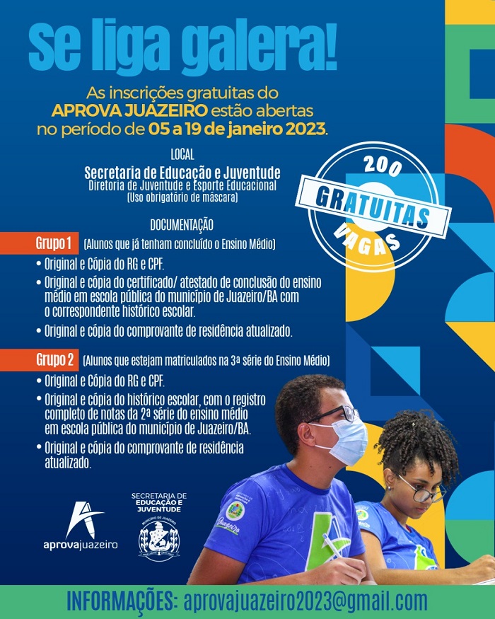 Encerra nesta quinta-feira (19), o período de inscrições para o processo seletivo do Programa Aprova Juazeiro, edição 2023. Realizado pela Prefeitura Municipal, através da Secretaria de Educação e Juventude (Seduc), o programa segue, pelo segundo ano consecutivo, ofertando 200 vagas, ampliando as condições de acesso ao Ensino Superior, para jovens que desejam entrar na universidade e se preparar para o mercado de trabalho.