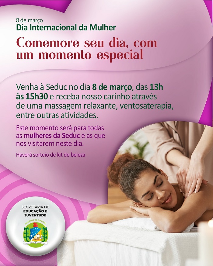 Com o objetivo de demonstrar gratidão e reconhecimento às mulheres que somam junto a gestão Suzana Ramos, a Prefeitura de Juazeiro, através da Secretaria de Educação e Juventude (Seduc), por meio do Núcleo de Cidadania dos Adolescentes (NUCA), preparou uma programação especial em homenagem ao Dia Internacional da Mulher, celebrado no dia 8 de março. Com oferta de serviços gratuitos, as atividades serão dedicadas a valorização do bem-estar do público feminino, que contará com a oferta de massagens relaxantes, ventosa terapia, sorteio de kit de beleza, entre outras.