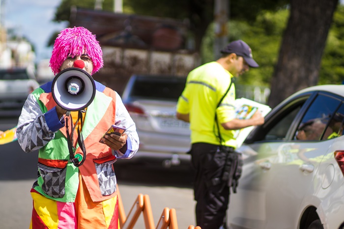 Dentro das ações da campanha Maio Amarelo, mês que tem a finalidade de conscientizar e prevenir acidentes de trânsito, a Prefeitura de Juazeiro, por meio da equipe de educação para o trânsito, da Companhia de Segurança, Trânsito e Transporte (CSTT) realizou, na manhã desta segunda-feira (08), uma abordagem educativa na Orla I da cidade, com a participação do palhaço Pouquinho.