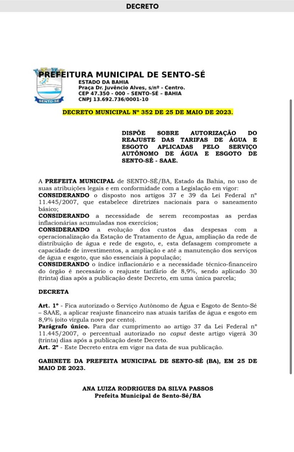Preparem o bolso, a conta de água vai ficar mais cara em Sento Sé, a partir de 25 de junho deste ano. A Prefeitura de Sento Sé autorizou, nesta quinta-feira (25), o aumento de 8,9% na tarifa de água e esgoto cobrada pelo Serviço Autônomo de Água e Esgoto (Saae). O reajuste foi publicado no Diário Oficial do Município (DOEM).
