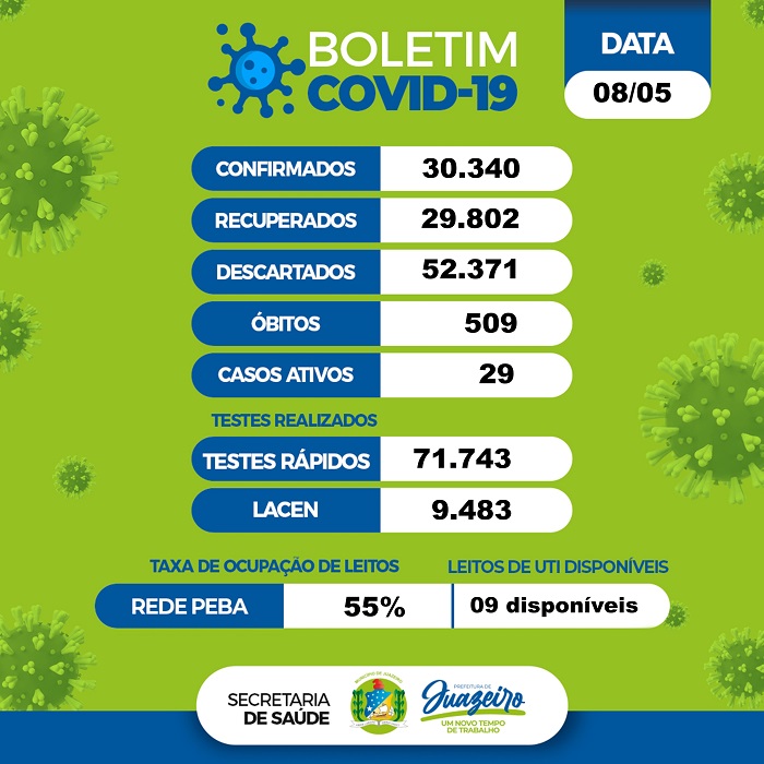 De acordo com o levantamento, 30.340 moradores foram infectados desde o início da pandemia na cidade, dos quais 29.802 já estão recuperados. Os casos descartados somam 52.371. Juazeiro tem 29 casos ativos do novo coronavírus.