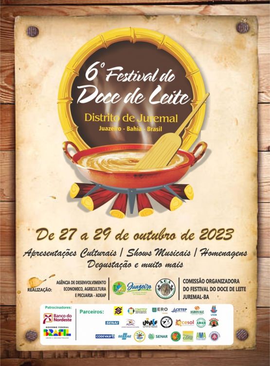 A Prefeitura de Juazeiro, divulgou nesta segunda-feira (16) a data e a programação oficial do 6º Festival do Doce de Leite de Juremal. O evento acontecerá entre os dias 27 e 29 de outubro, na sede do distrito de Juremal, e contará com uma vasta programação cultural, gastronômica e comercial. O evento é uma realização da Prefeitura de Juazeiro, por meio da Agência de Desenvolvimento Econômico, Agricultura e Pecuária (Adeap), Associação Comunitária de Angical (ACA) e Comissão Organizadora do Festival do Doce de leite de |Juremal, com patrocínio do Banco do Nordeste e Governo Federal.