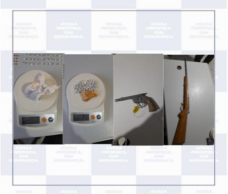 O suspeito que estava na residência confessou que havia escondido armas de fogo no sítio de um amigo. Os policiais foram à propriedade e apreenderam um revólver e uma espingarda.