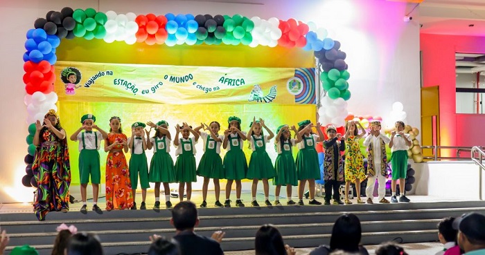 Com o tema ‘Viajando na Estação, eu giro o mundo e chego na África’, do projeto pedagógico desenvolvido durante o ano letivo, a escola recepcionou o público com diversas atividades alusivas à proposta, entre apresentações de dança, música, distribuição de lembrancinha, culinária afro e, claro, muitas homenagens dedicadas à escola e aos profissionais da instituição.