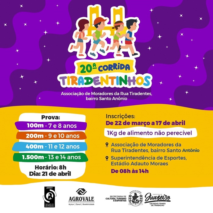 Seguem abertas até o dia 17 de abril, as inscrições para a 20ª Corrida Tiradentinhos. A competição é uma realização da Prefeitura de Juazeiro, através da Secretaria de Cultura, Turismo e Esporte (Seculte), em parceria com a Associação de Moradores da Rua Tiradentes.