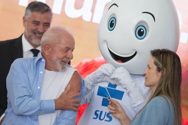 O presidente Luiz Inácio Lula da Silva (PT) se vacinou contra a gripe, nesta segunda-feira (8/4), em evento no Palácio do Planalto. O chefe do Executivo recebeu a imunização ao lado da ministra Nísia Trindade, da Saúde, e do mascote Zé Gotinha.