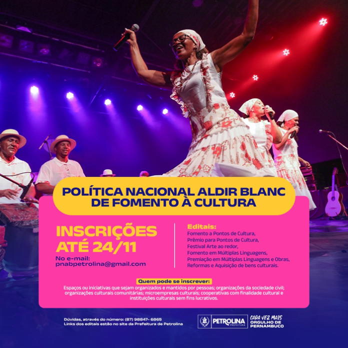 A Prefeitura de Petrolina faz um alerta a todos os fazedores de cultura do município, que o prazo para as inscrições dos editais da Política Nacional Aldir Blanc de Fomento à Cultura (PNAB), encerra neste domingo (24). A Secretaria executiva de Cultura vai realizar, neste sábado (23), um plantão presencial para tirar dúvidas e orientar como se inscrever nos editais. As pessoas que desejarem tirar dúvidas, podem ir até a sala da Philarmônica, no Núcleo Administrativo Municipal, que fica na Avenida Coronel Clementino Coelho, n° 174, no bairro Parque Bandeirantes (Atrás da Banca).