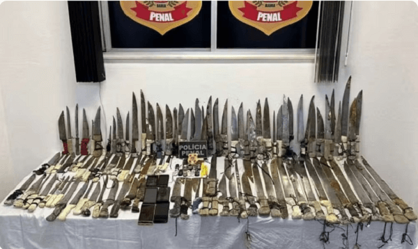 Diversos objetos ilícitos foram apreendidos no Conjunto Penal de Eunápolis, no extremo sul da Bahia, nesta semana, em revistas iniciadas após a 16 detentos fugirem da unidade. Entre o material, estão 96 facas e facões, 18 celulares, anotações com contabilidades suspeitas e pendrives.