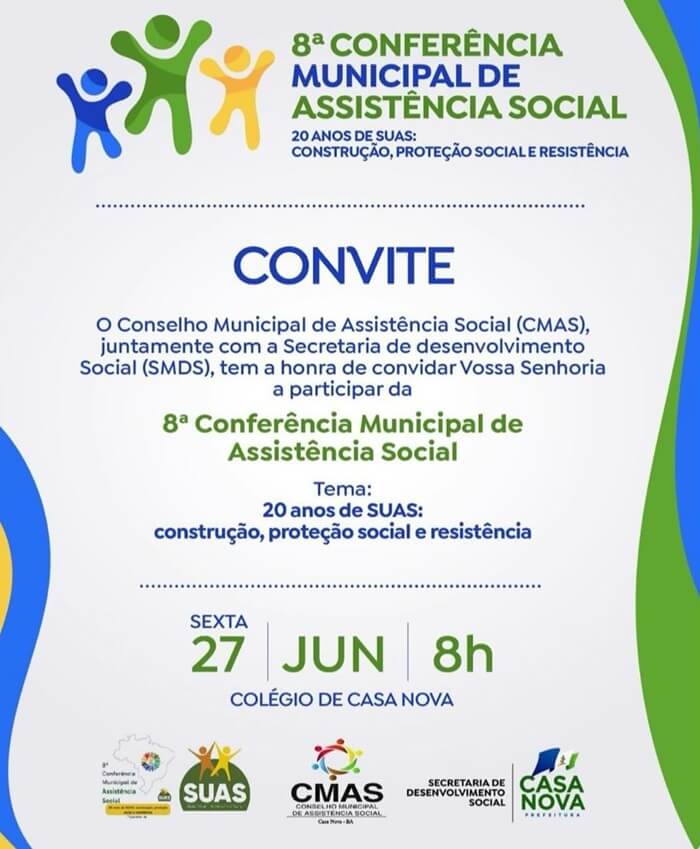 A Prefeitura de Casa Nova, por meio da Secretaria Municipal de Desenvolvimento Social e do Conselho Municipal de Assistência Social (CMAS), realiza nesta sexta-feira (27), a 8ª Conferência Municipal de Assistência Social. O encontro acontece no Colégio de Casa Nova, a partir das 8h da manhã, com o tema: “20 anos do SUAS: construção, proteção social e resistência”.