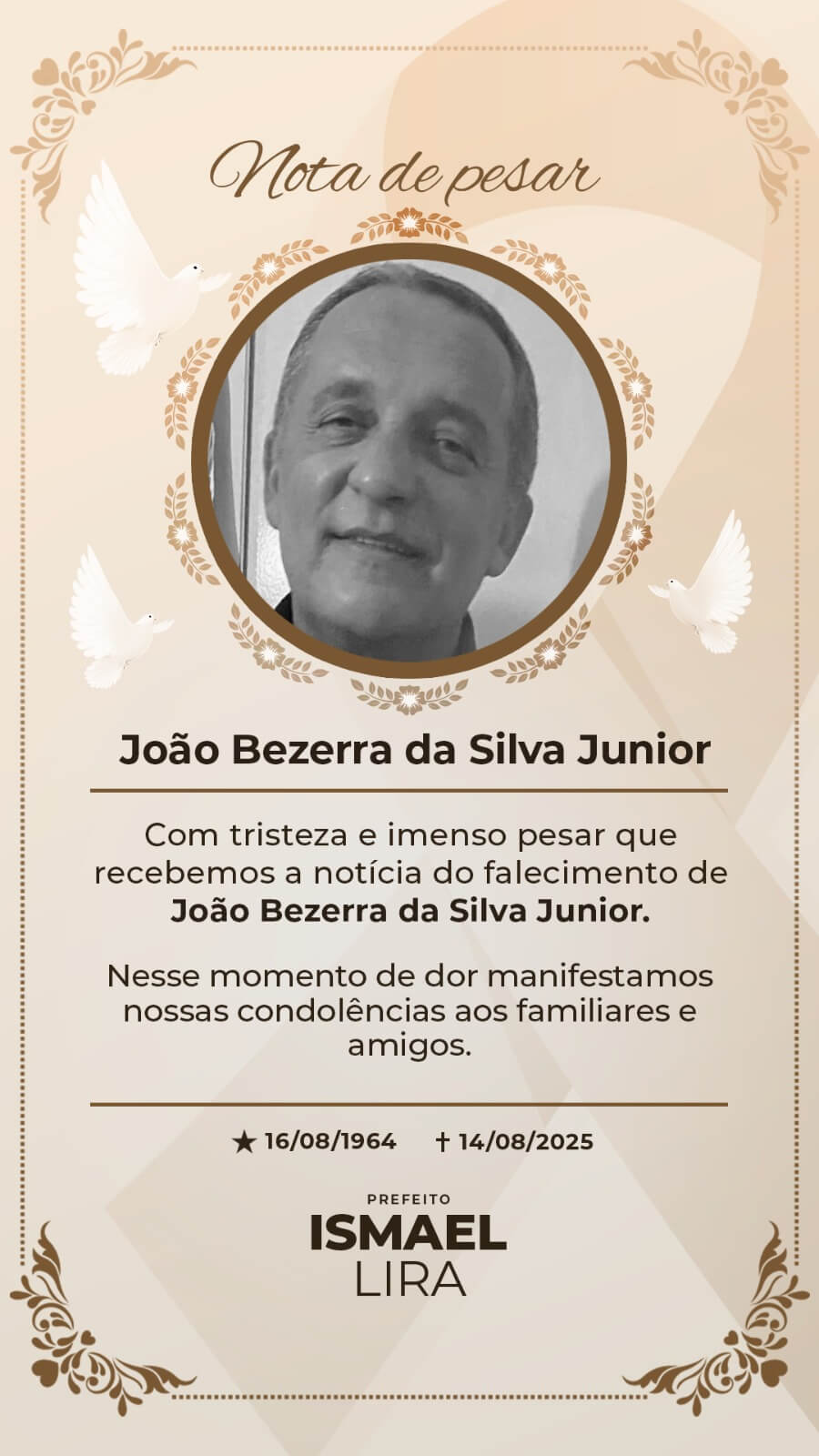 Entrar Bem-vindo! Entre na sua conta seu usuário sua senha Esqueceu sua senha? obter ajuda Crie a sua conta aqui Crie a sua conta aqui Bem vinda! registre-se para uma conta seu e-mail seu usuário Uma senha será enviada por e-mail para você. Recuperar senha Recupere sua senha seu e-mail Uma senha será enviada por e-mail para você. InícioCidadePrefeito de Orocó lamenta o falecimento de João Bezerra Prefeito de Orocó lamenta o falecimento de João Bezerra Author Fábio Cardoso Date 14 de agosto de 2025 Category Cidade Compartilhado FacebookTwitterWhatsAppTelegram Com tristeza e imenso pesar que recebemos a notícia do falecimento de João Bezerra da Silva Junior. Nesse momento de dor manifestamos nossas condolências aos familiares e amigos. Ismael Lira – Prefeito de Orocó Artigo anteriorCâmara de Vereadores de Juazeiro aprova recomposição salarial para servidores do SAAEPróximo artigoRetroescavadeira: Mais ações para o povo de Lagoa Grande (PE) Veja também Senado aprova Dia Nacional do Orgulho Autista; projeto vai à sanção R$ 25 milhões para transformar o hospital: Gestão Anisio Viana conquista maior obra dos últimos 45 anos em Casa Nova Motociclista se dá mal ao tentar atravessar trecho alagado na Zona Rural de Curaçá Recent posts Eliane Sores é agraciada com o Título de Cidadã Ouricuriense. A indicação é da Verª Willine Matos 7 de março de 2026 Senado aprova Dia Nacional do Orgulho Autista; projeto vai à sanção 7 de março de 2026 R$ 25 milhões para transformar o hospital: Gestão Anisio Viana conquista maior obra dos últimos 45 anos em Casa Nova 6 de março de 2026 Deputado Roberto Carlos articula obras de infraestrutura para Uauá e Ibipitanga em audiência na Seinfra 6 de março de 2026 Prefeitura de Petrolina leva mais de mil estudantes para vivenciar o cinema regional 6 de março de 2026