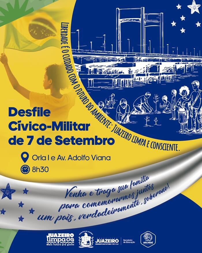 “Liberdade é o cuidado com o futuro do ambiente: Juazeiro limpa e consciente”, esse será o tema do tradicional desfile cívico-militar de 7 de setembro, em Juazeiro. Coordenado pela Prefeitura de Juazeiro, por meio da Secretaria de Educação, o desfile faz parte das comemorações dos 203 anos da Independência do Brasil e vai chamar a atenção da população para a importância do cuidado com a cidade e com o meio ambiente.