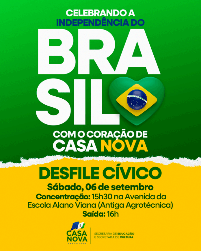 A Prefeitura de Casa Nova, por meio das Secretarias de Educação e Cultura, realizará neste sábado (06) o desfile cívico em comemoração à Independência do Brasil. Estudantes de 14 escolas das redes municipal, estadual e particular desfilarão pelas ruas da cidade.
