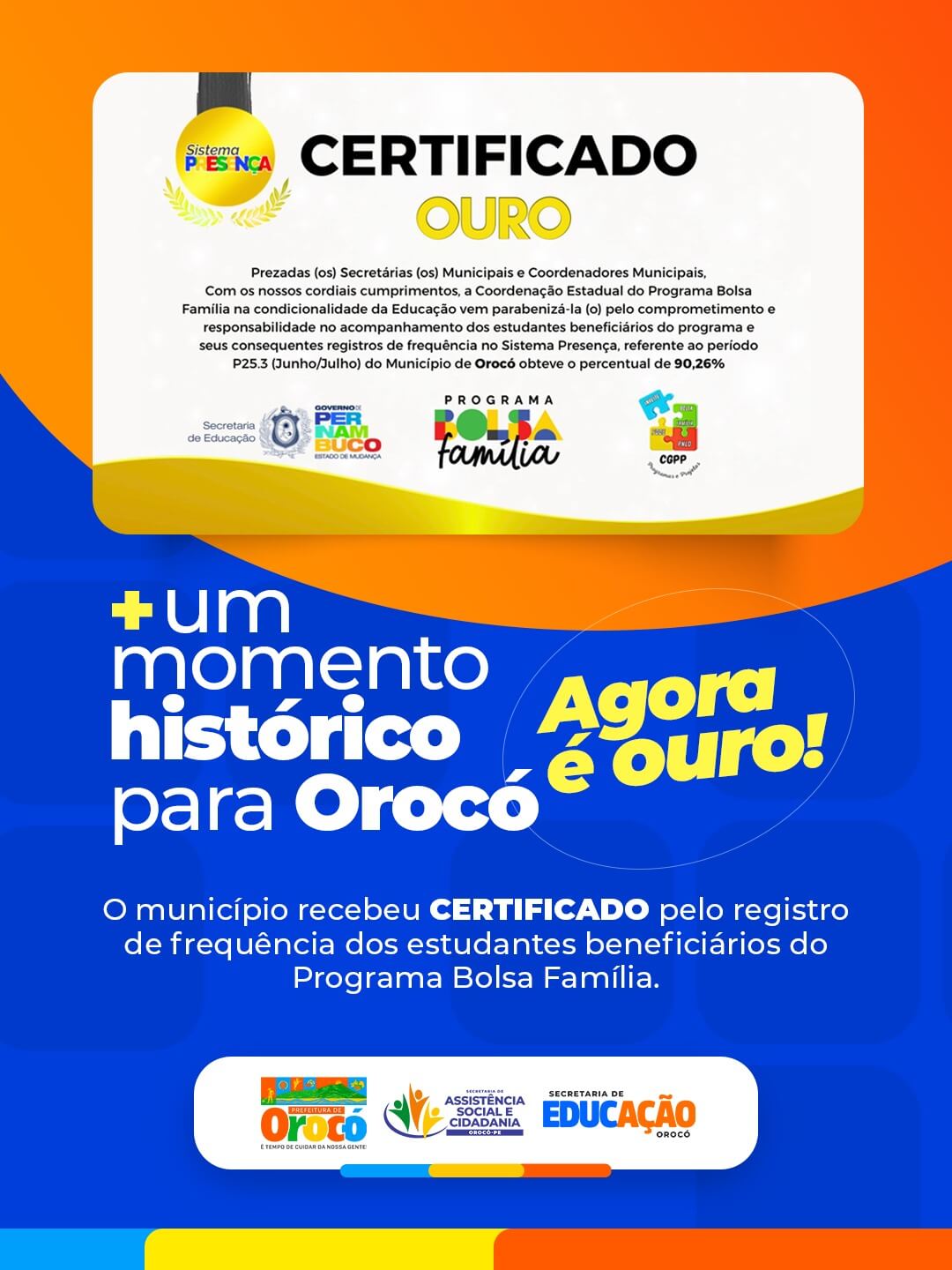 O município de Orocó alcançou um marco histórico na educação ao conquistar, pela primeira vez, o Certificado Ouro do Sistema Presença, concedido pela Coordenação Estadual do Programa Bolsa Família. O reconhecimento é resultado do índice de 90,26% de frequência escolar registrado no período P25.3 (junho/julho), superando as metas estabelecidas pelo programa.