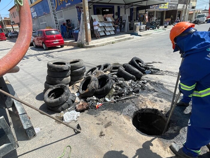 Nesta terça-feira (9), a equipe de manutenção da Bacia do Dom Avelar foi surpreendida quando, ao tentar desobstruir um poço de visita (PV) na Rua 12 do bairro Santa Luzia, foram encontrados dezenas de pneus e outros materiais descartados dentro da rede de saneamento. Além de prejudicar o pleno funcionamento do sistema de esgotamento na comunidade, quem for flagrado descartando resíduos sólidos na rede de saneamento poderá responder legalmente, conforme previsto na Lei Complementar de Resíduos Sólidos nº 35/2022.