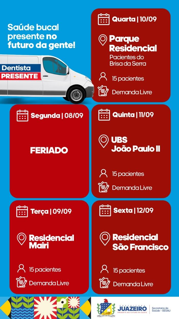 A Unidade Móvel de Atendimento Odontológico (UMO) segue levando serviços para a população. A iniciativa realizada pela Prefeitura de Juazeiro, por meio da Secretaria Municipal de Saúde (Sesau) irá oferecer, entre os dias 09 e 12 de setembro, 15 atendimentos diários a partir das 8h. É necessário que os pacientes apresentem RG, CPF e Cartão SUS.