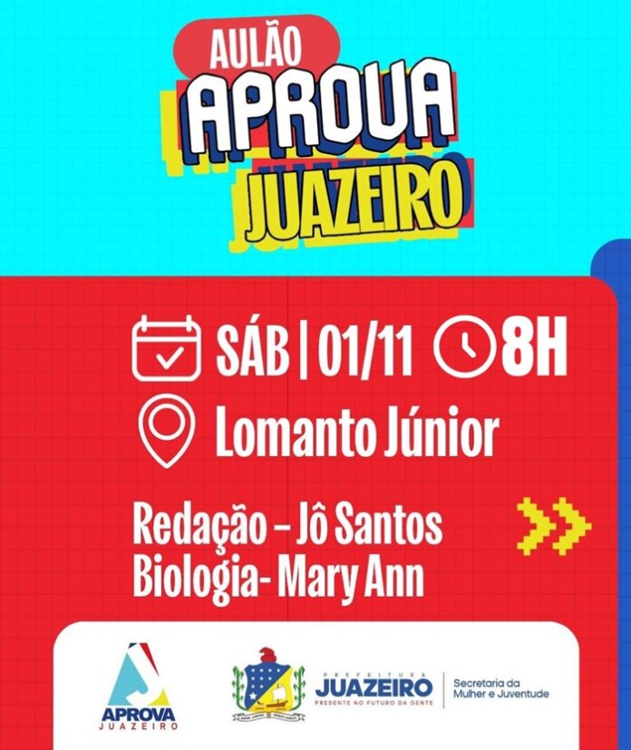 A Prefeitura de Juazeiro, por meio da Secretaria da Mulher e Juventude/SMJ), está com inscrições abertas para o segundo ciclo de aulões do programa Aprova Juazeiro, que será realizado neste sábado, 1º de novembro, no Colégio Lomanto Júnior, localizado na Rodovia Lomanto Júnior, Km 3 – s/n, Castelo Branco, das 8h às 12h.