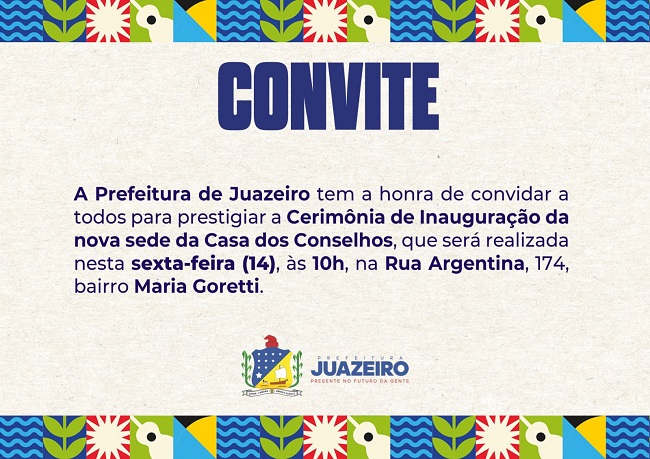 A Prefeitura de Juazeiro tem a honra de convidar a todos para prestigiar a Cerimônia de Inauguração da nova sede da Casa dos Conselhos, que será realizada nesta sexta-feira (14), às 10h, na Rua Argentina, 174, no bairro Maria Goretti.