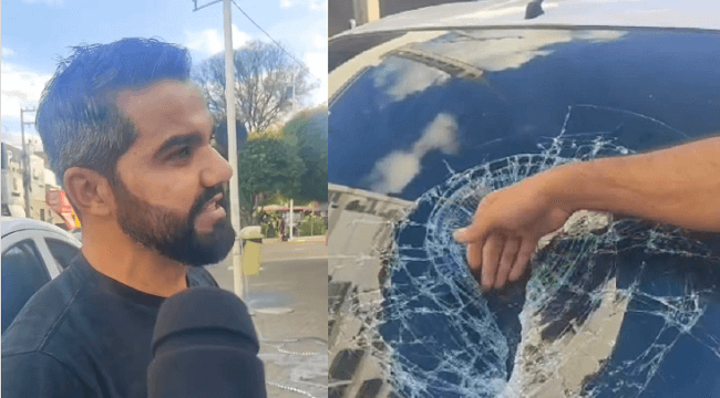 “O para-brisa entrou para dentro do painel. Se tivesse caído na minha cabeça ou na cabeça de qualquer outra pessoa, acho que já era finado, né? Eu queria saber que prefeitura é essa que está montando essas ornamentações e não faz fiscalização, porque o negócio tem que estar bem amarrado, bem estruturado. Botaram só no gancho lá… só tinha um ganchinho, e caiu. Olha isso aqui. Agora, imagine se fosse na cabeça de alguma pessoa, no corpo… tinha aleijado ou matado, né?