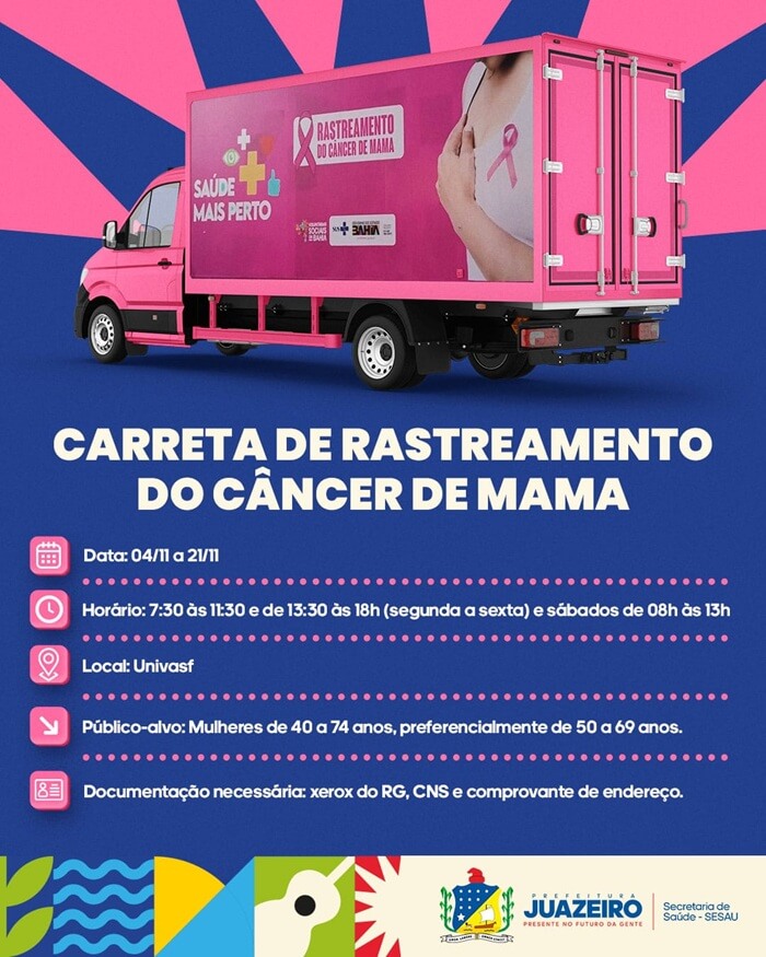 A Prefeitura de Juazeiro, por meio da Secretaria Municipal de Saúde/Sesau, inicia nesta terça-feira (4) mais uma importante ação de prevenção e cuidado com a saúde da mulher. A Carreta de Rastreamento do Câncer de Mama estará no município até o dia 21 de novembro, oferecendo mamografias gratuitas para mulheres dentro da faixa etária preconizada pelo Ministério da Saúde.