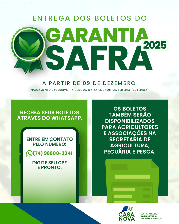 A partir desta terça-feira (9), os agricultores de Casa Nova contam com uma nova e prática forma de acessar os boletos do Garantia Safra 2025. Pensando em tornar o processo mais rápido e acessível, a Prefeitura Municipal, por meio da Secretaria de Agricultura, Pecuária e Pesca, disponibiliza o atendimento diretamente pelo WhatsApp.