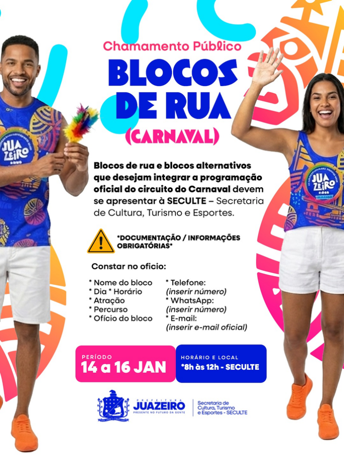 A Prefeitura de Juazeiro, por meio da Secretaria de Cultura, Turismo e Esportes (Seculte), realiza chamamento público para blocos de rua e blocos alternativos interessados em integrar a programação oficial do circuito do Carnaval. A iniciativa busca garantir organização, segurança e valorização das manifestações culturais, respeitando as normas legais que regem o evento.