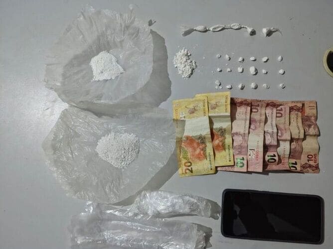 No local, os policiais encontraram porções de cocaína espalhadas sobre uma mesa e também no chão da residência. Ao todo, foram apreendidas 18 pedras e cinco trouxas da droga em pó, além de duas sacolas contendo o mesmo material. Também foram recolhidos R$ 100 em dinheiro, uma carteira, sacos plásticos usados para embalar drogas e um aparelho celular.