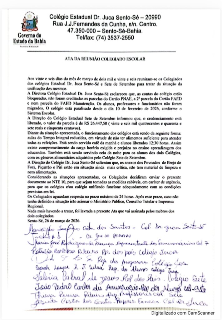 Estudantes e professores do Colégio Estadual Dr. Juca Sento Sé, realizaram uma manifestação na manhã desta terça-feira (31) para denunciar a falta de recursos na unidade escolar. O ato ocorreu em frente à escola e chamou a atenção da comunidade.